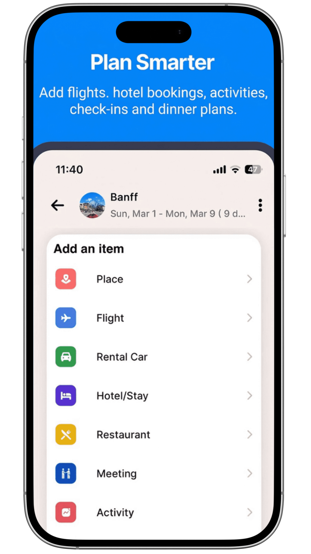 Perfect for Euro-trips or cross-country road trips. Add multiple stops, manage dates for each, and keep your entire journey organized in one flow.